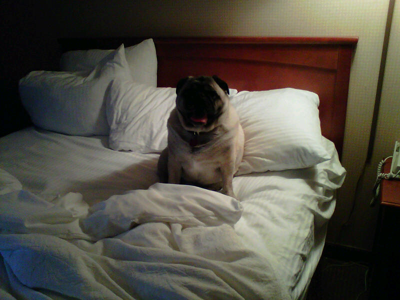 I gots to stay in hotels and boy did I have funs! Mum said I was so hyper that nights. I was tearing down the hotel hallway and running around the room playing with my toys. I gots to sleep on a big fluffy bed with Mum. Mum hads to put a stool beside the beds so I could get up on the bed BOL.
